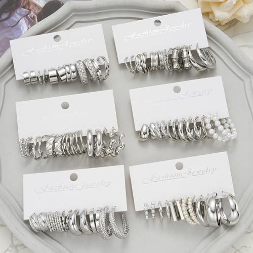 36 Pairs Gold Hoop Earrings Set for Women, Fashion Chunky Gold Hoop Earrings Multipack, Hypoallergenic Pearl Chain Twisted Statement Earring Pack for Birthday Party Jewelry