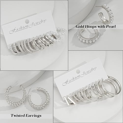 42 Pairs Gold Hoop Earrings Set for Women, Fashion Chunky Pearl Earrings Multipack Twisted Statement Earring Pack, Hypoallergenic Small Big Hoops Earrings for Birthday Party