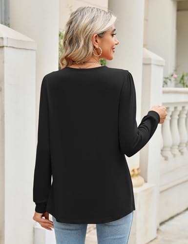 AKEWEI Womens Long Sleeve Shirts Puff Sleeve V Neck Pleated Shirts Loose Fit Blouses for Dressy Casual 2025 Spring Tops