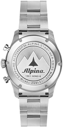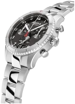 The Startimer Pilot Quartz Chronograph Big Date comes on a brushed and polished 41mm stainless steel case featuring a chronograph at 3 o'clock, a seconds counter at 6 o'clock along and a chronograph with 30 minutes counter at 9 o'clock. The white dial has printed black Arabic numbers, silver-tone hour and minute hands filled with silver-tone luminous treatment, a silver-tone chronograph second hand with the signature Alpina red triangle, and a big date window at 6 o'clock. Set on a stainless steel 3-link bracelet, it is water resistant to 100M.