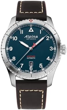 The Alpina Startimer Automatic, inspired by its heritage look and incomparable precision, features a 44mm green dial, stainless steel case, and set on brown leather strap. WR to 30M Perfect for the aviator at heart.