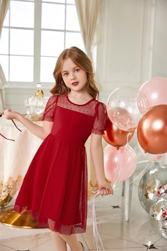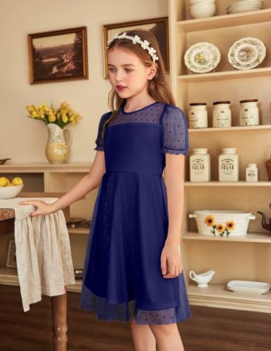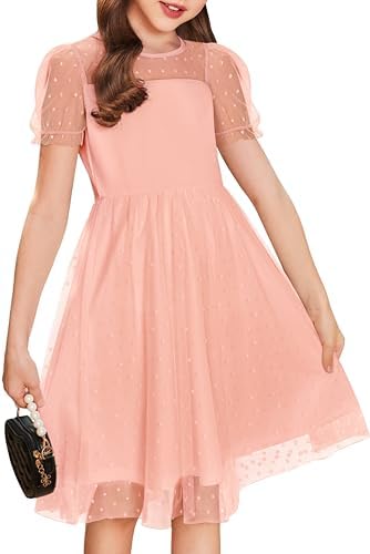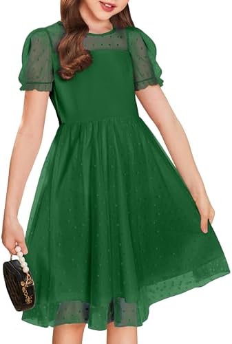 Arshiner Girls Dress Contrast Mesh Puffy Short Sleeve A Line Casual Party Dress 3-12 Years