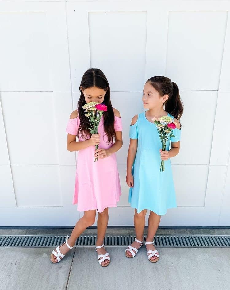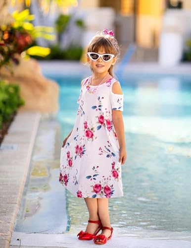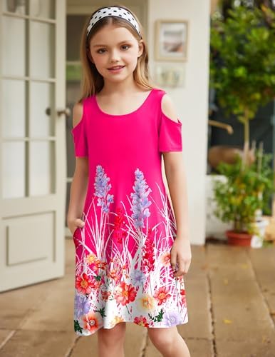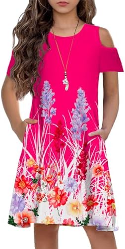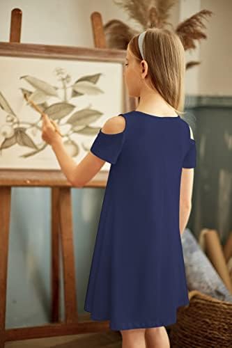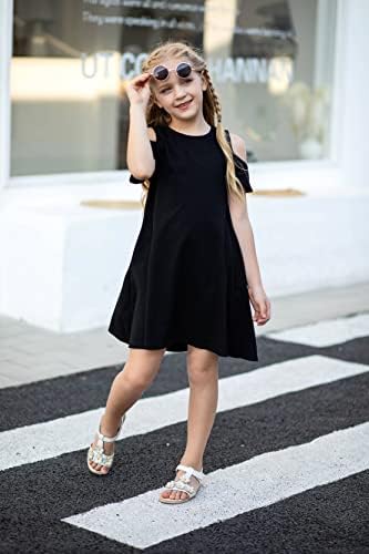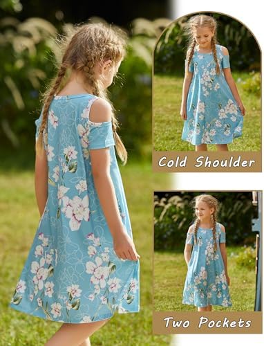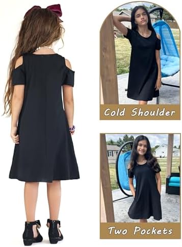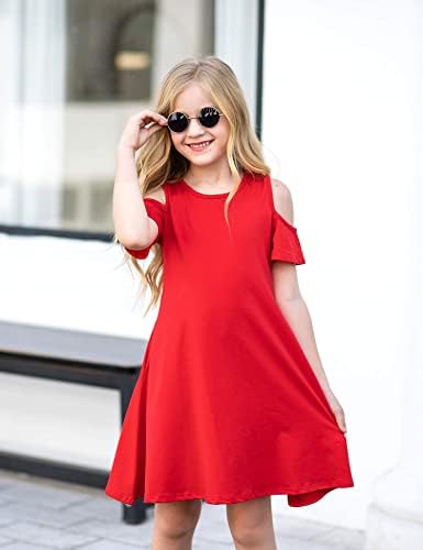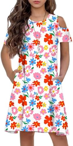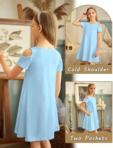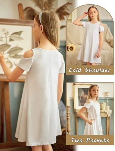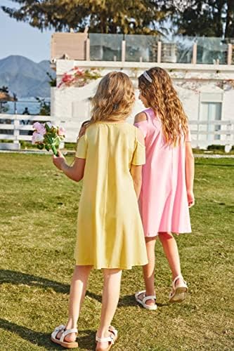 Arshiner Girls Summer Dress Short Sleeve Cold Shoulder Solid Color Swing Casual Dresses with Pockets