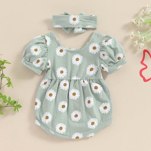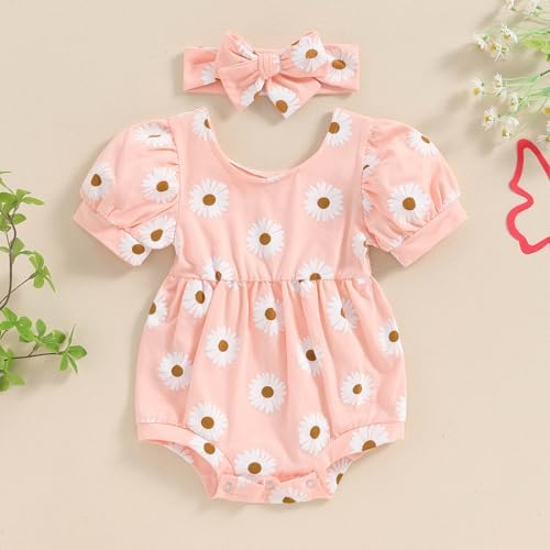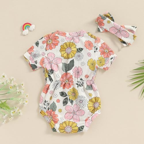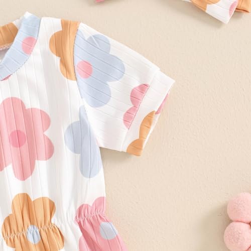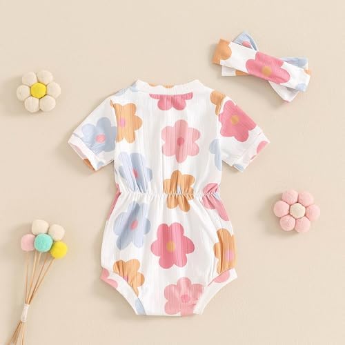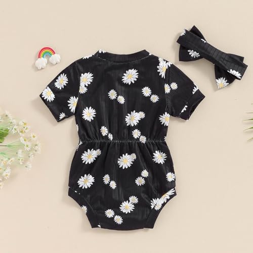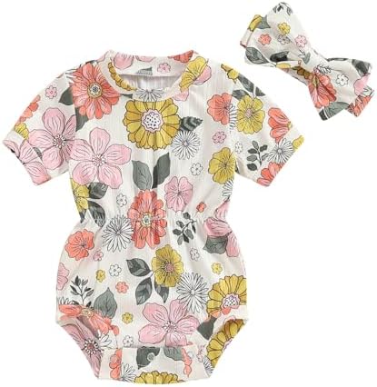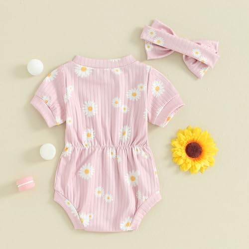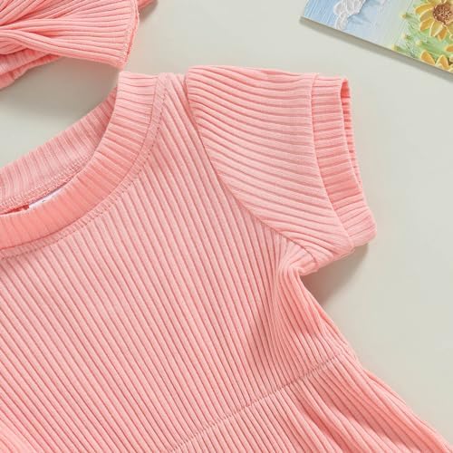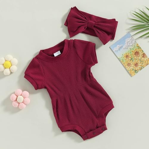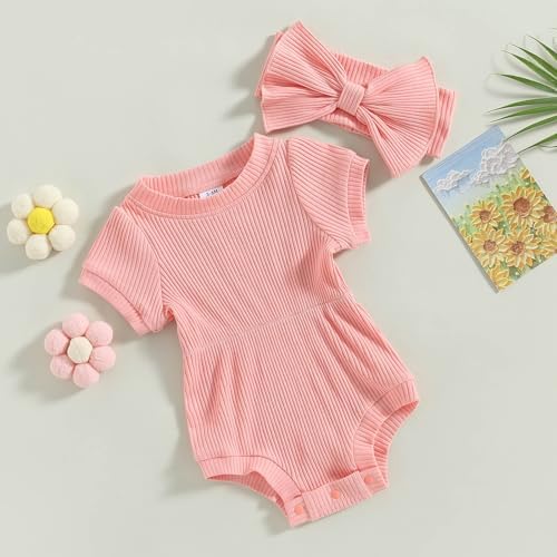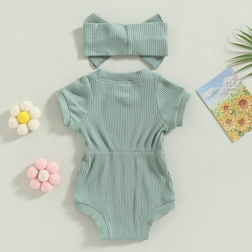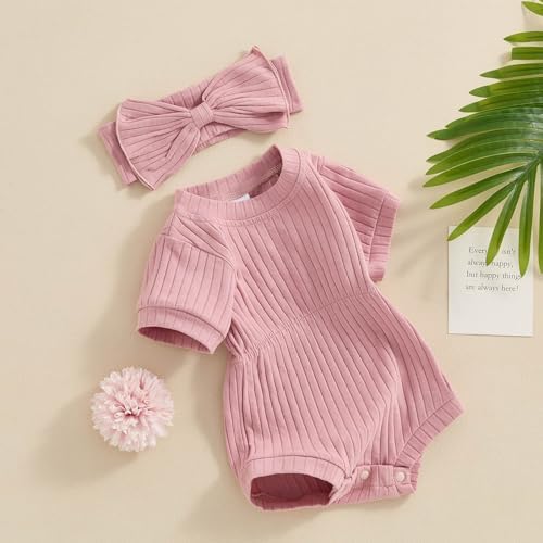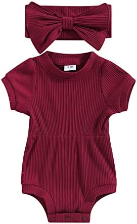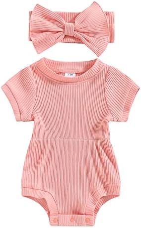 Baby Girl Summer Clothes Ribbed Short Sleeve Romper Solid Color Bodysuits Bow Headband Outfit Newborn Girl Jumpsuit