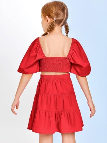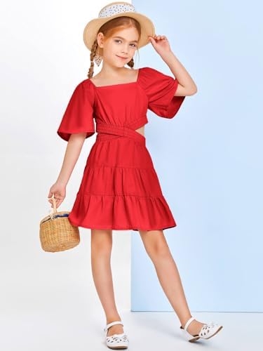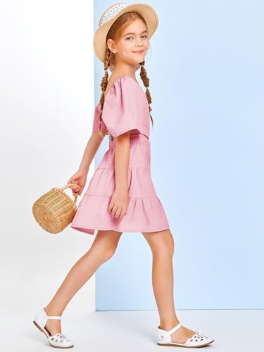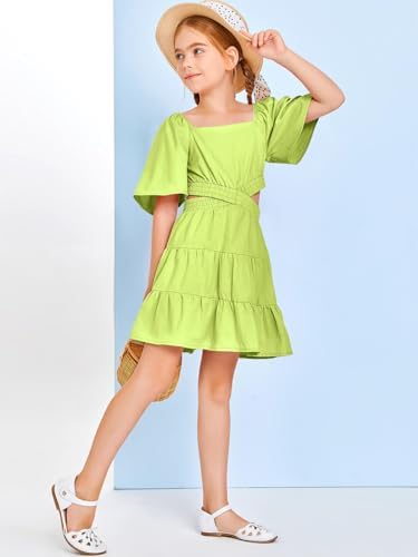Batermoon Girls Summer Dress Square Neck Short Sleeve Crossover Waist Casual A-line Mini Dress