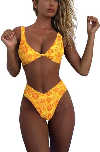 Bikini Set for Women Solid V Neck Knot Front Push Up High Leg Thong Two Piece Swimsuit