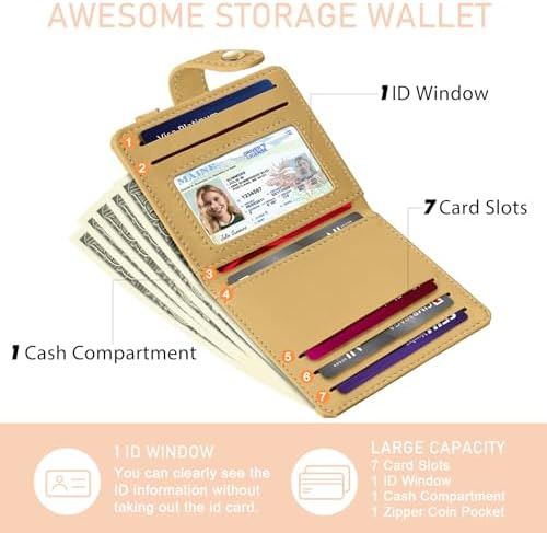 GOIACII Small Women Wallet Genuine Leather RFID Blocking Bifold Zipper Pocket Card Holder with ID Window