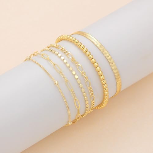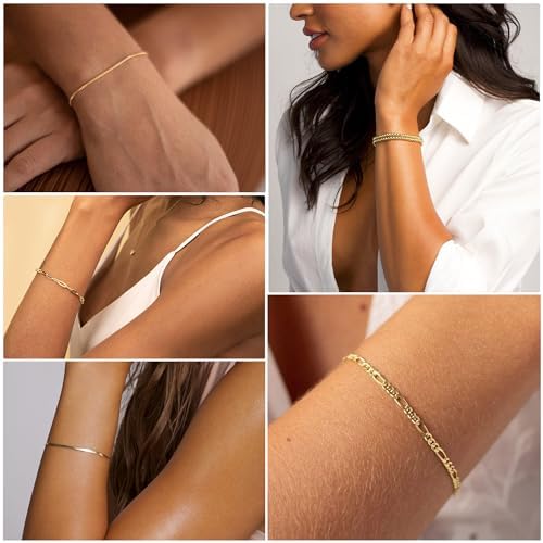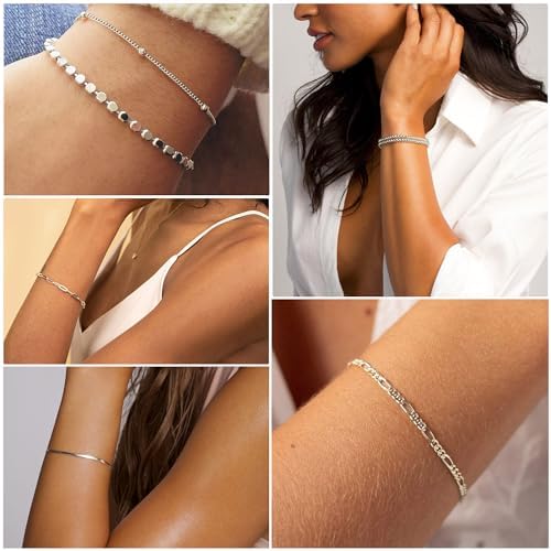 DEARMAY Dainty Silver Chain Bracelets for Women Trendy, Waterproof Sterling Silver/Gold Jewelry Sets Fashion Stackable Beaded Figaro Herringbone Paperclip Chain Bracelet Pack Stack Gifts for Womens