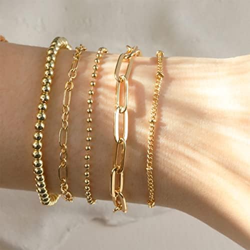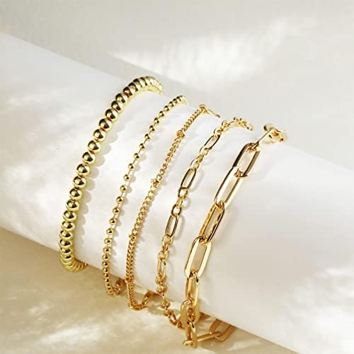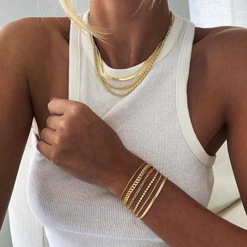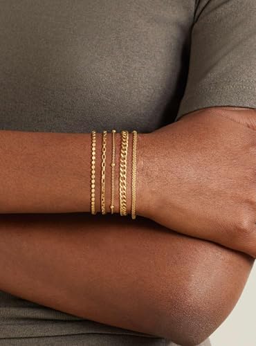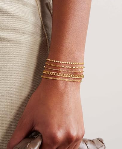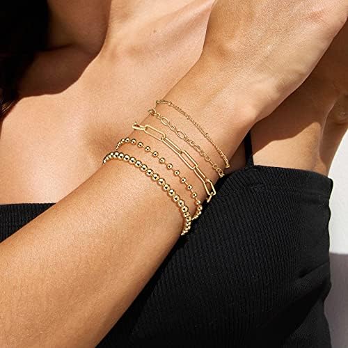Gold Bracelet for Women Stack 14K Real Gold Plated Bangle Cuff Bracelet Set Gold Beaded Tennis Paperclip Cuban Link Chain Bracelets for Women Trendy Non Tarinish