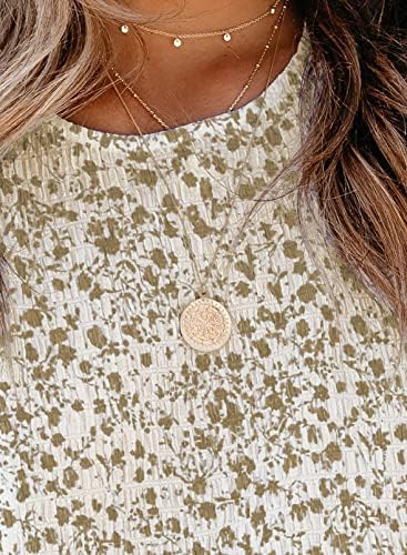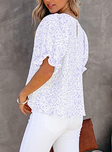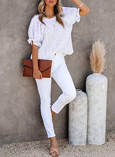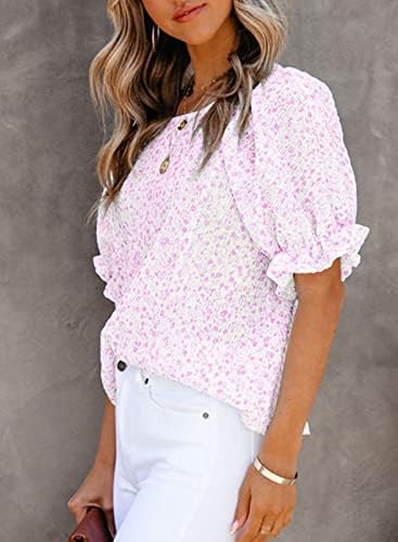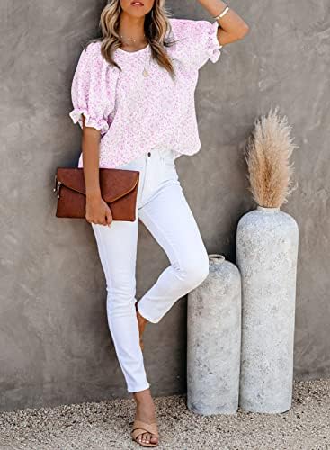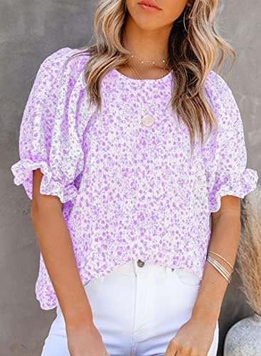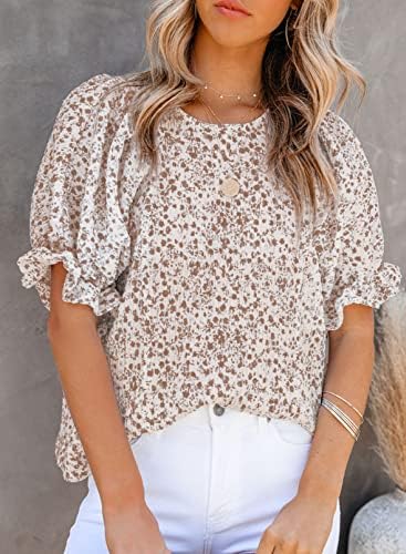 Dokotoo Floral Print Blouses for Women Crewneck Smocked Puff Sleeve Shirts Casual Babydoll Tops