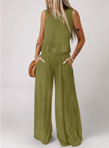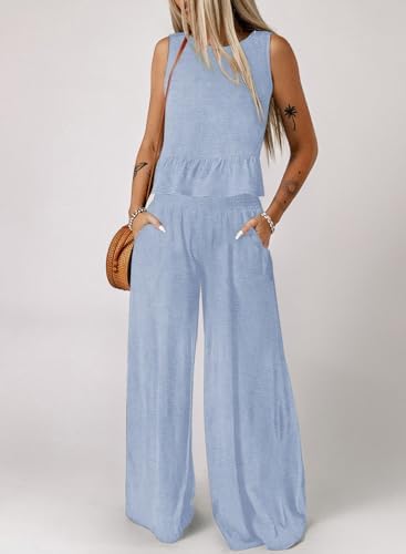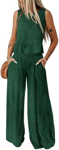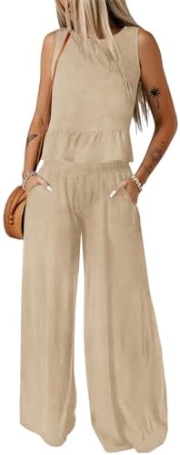 Dokotoo Pants Sets Women 2 Piece Outfits Sleeveless Round Neck Tank Tops Matching Sets for Women Elastic Waist Wide Leg