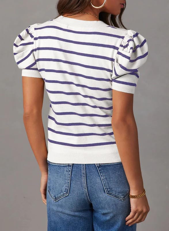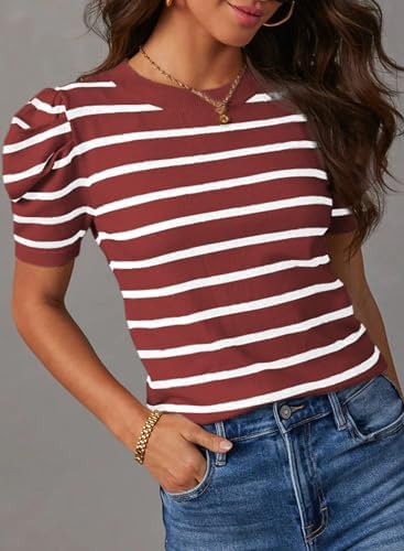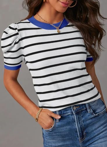 Dokotoo Women's Short Puff Sleeve Knit Tops 2024 Trendy Crewneck Striped T Shirts Casual Summer Blouses