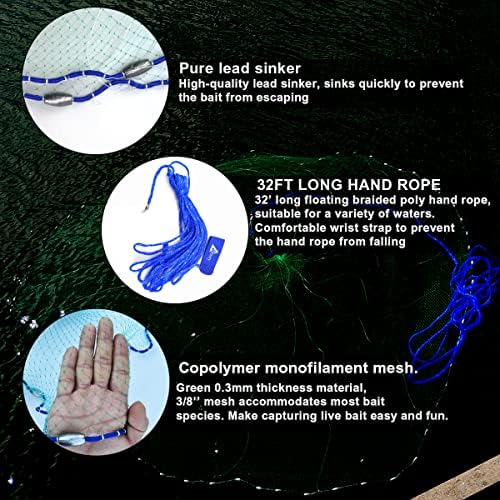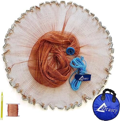 Drasry Saltwater American Fishing Cast Net 3/8inch Mesh Size for Bait Shrimp Trap Fish Heavy Duty Sinkers Throw Net 3FT/4FT/5FT/6FT/7FT/8FT/9FT/10FT Radius