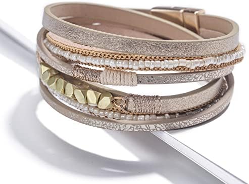 FANCY SHINY Boho Wrap Bracelets Leather Cuff Bangle Gold Beaded Bracelets for Women Stackable Infinity Bracelets Jewelry with Magnetic Clasp