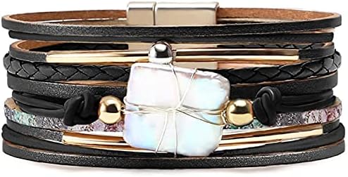 Fesciory Leopard Bracelet for Women, Boho Leather Wrap Multi-Layer Pearl Crystal Bracelet Bangle Jewelry