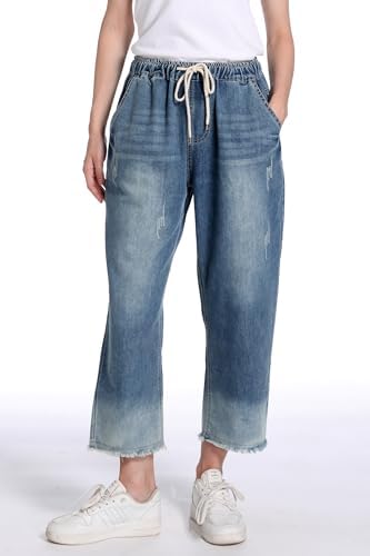FTCayanz Women's Elastic Waist Cropped Jeans Baggy Drawstring Stretch Denim Pants with Pockets