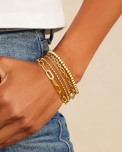 Gold Bracelet for Women Stack 14K Real Gold Plated Bangle Cuff Bracelet Set Gold Beaded Tennis Paperclip Cuban Link Chain Bracelets for Women Trendy Non Tarinish