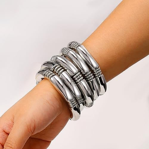 Gold Chunky Bangles Bracelets For Women 14k Gold Plated Stack Layered Curved Bamboo Tube Stretch Bracelets Gift Jewelry