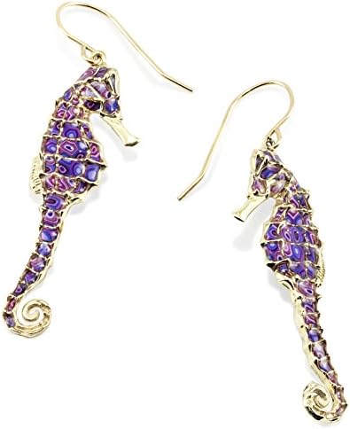 Gold Plated Silver Seahorse Jewelry Set for Women Nautical Handmade Purple Pattern Polymer Clay Aquatic Necklace and Small Sea Creature Drop Earrings, 16.5" Gold Filled Chain