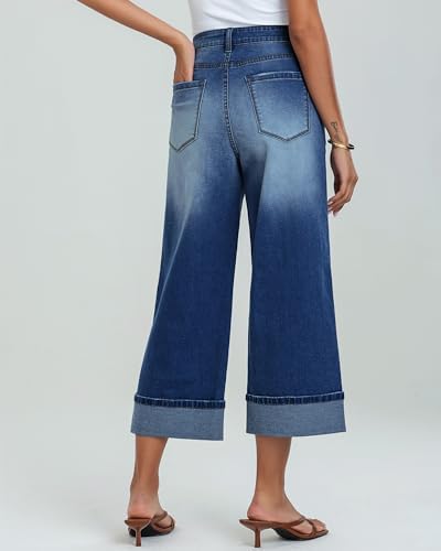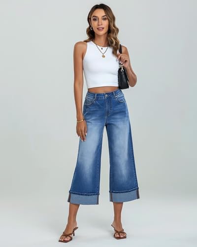 GRAPENT Wide Leg Jeans for Women High Waisted Stretchy Denim Capri Pants Fold Hem Cropped Baggy Capris Jeans with Pocket