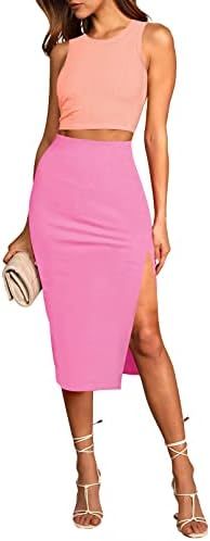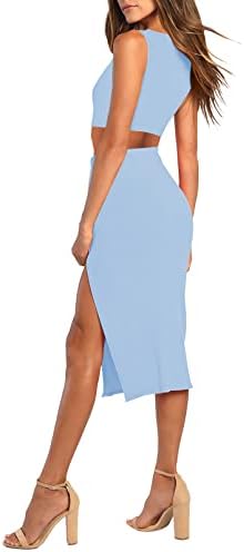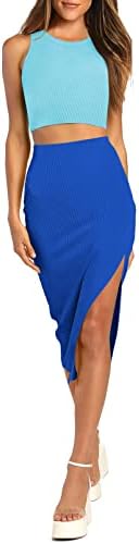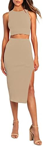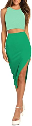 HUUSA 2 Piece Dress for Women Sexy Sleeveless Slim Bodycon Split Midi Dresses Casual Crewneck Tank Tops High Waist Skirt Sets