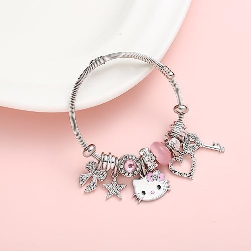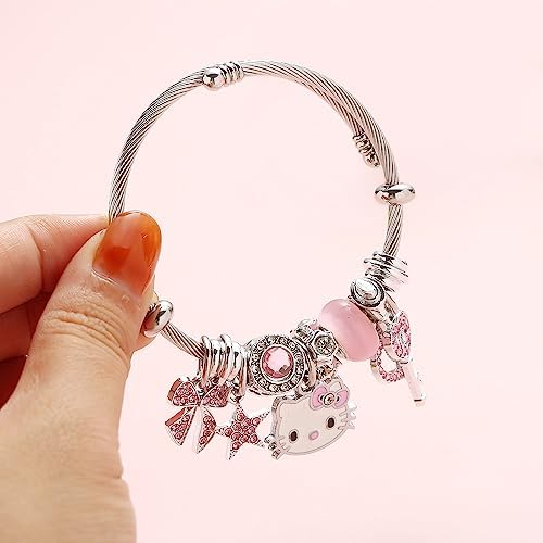 Kawaii Pink Bangle Bracelets with Jewelry Box, Adjustable Stainless Steel Bangle Bracelets Anime Cartoon Bracelet Gifts for Women Girls