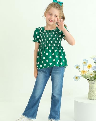 Kucnuzki Toddler Kids Girls Clothes Short Sleeve Shirt Top Flare Denim Jeans 2 Piece Outfits For Girls Cute Clothing Set