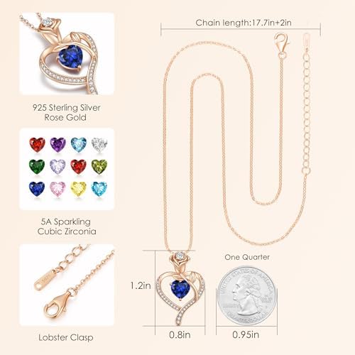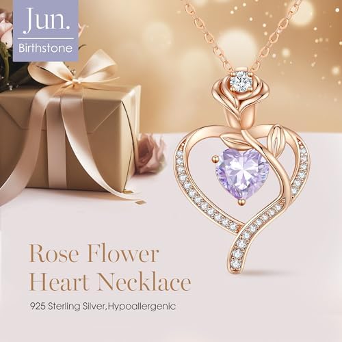 LOUISA SECRET Rose Flower Heart Birthstone Necklaces for Women, 925 Sterling Silver Fine Jewelry, Pendant Heart Necklaces Birthday Anniversary Christmas Gift for Women Wife Mom Girlfriend Lady