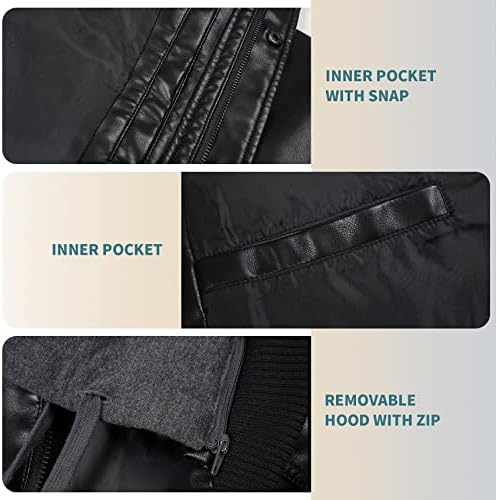 Mens Faux Leather Jacket, Padded Windbreaker, Motorcycle Biker Bomber Coat with Hood