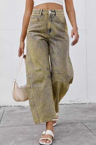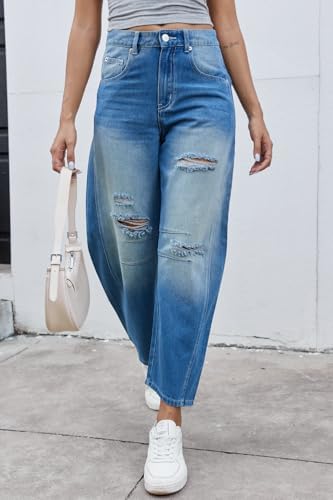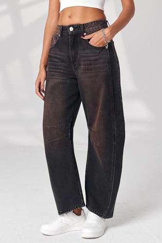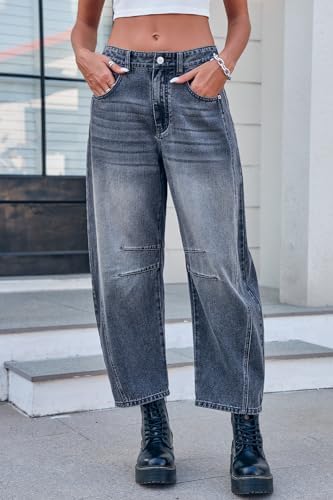 Mid Rise Barrel Jeans for Women Wide Leg Mid Waist Cropped Denim Pants Y2k Baggy Boyfriend Jeans with Pockets