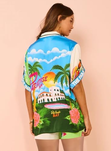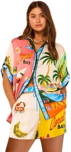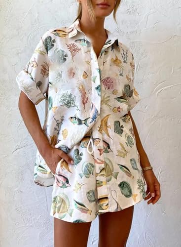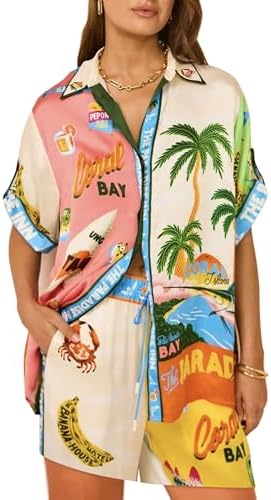 Peaceglad Women's Print 2 Piece Pajama Set Short Sleeve Button Down Tops Drawstring Shorts Loungewear Sleepwear Sets