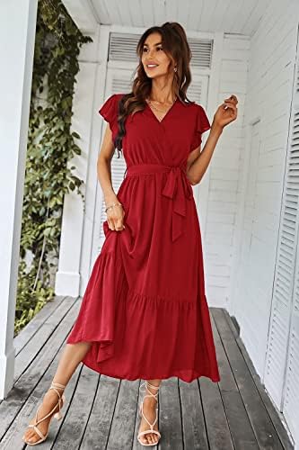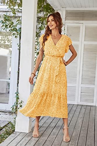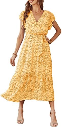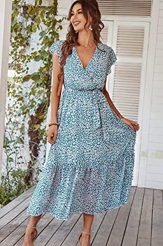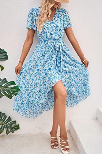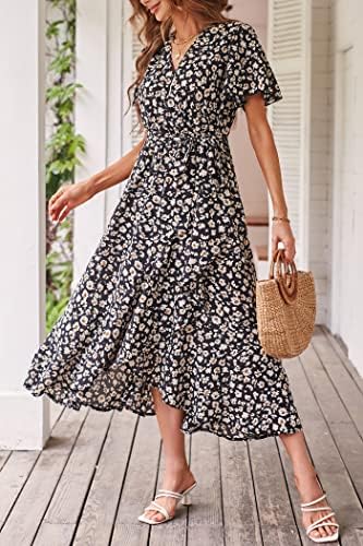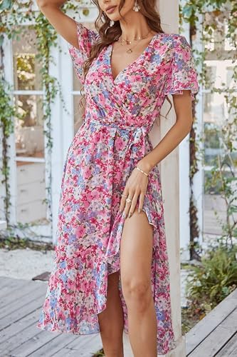 PRETTYGARDEN Women's 2024 Floral Boho Dress Wrap V Neck Short Sleeve Belted Ruffle Hem A-Line Flowy Maxi Dresses