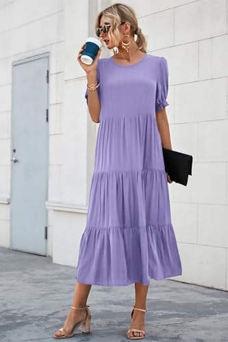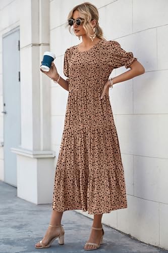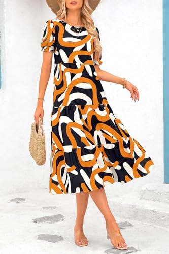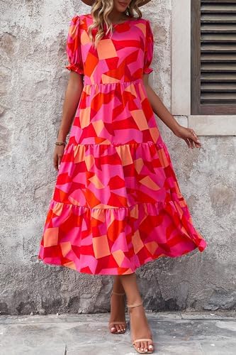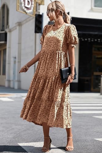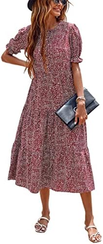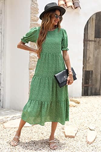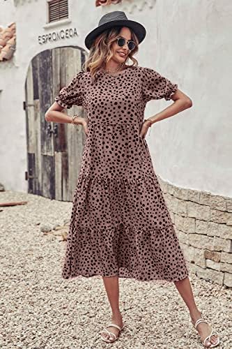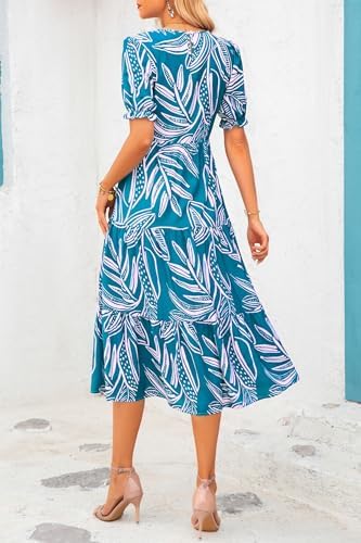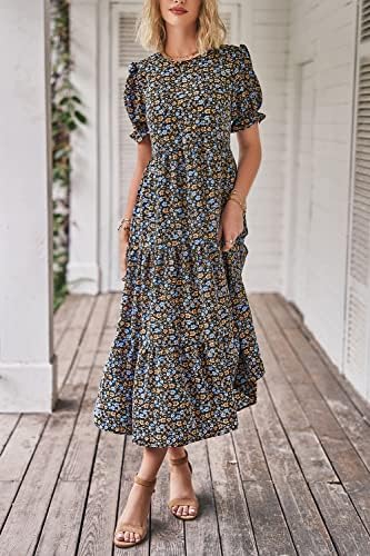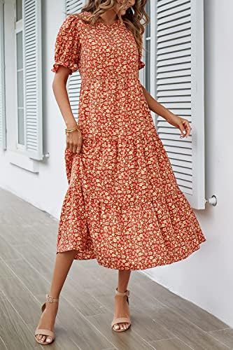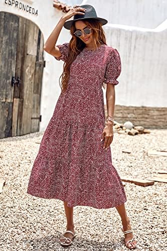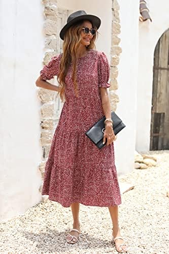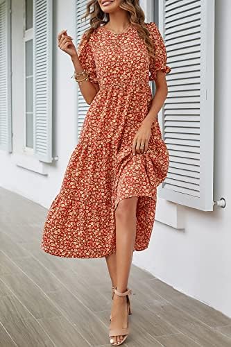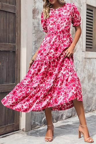 PRETTYGARDEN Women's Summer Casual Boho Dress Floral Ruffle Puff Sleeve High Waist Midi Beach Dresses