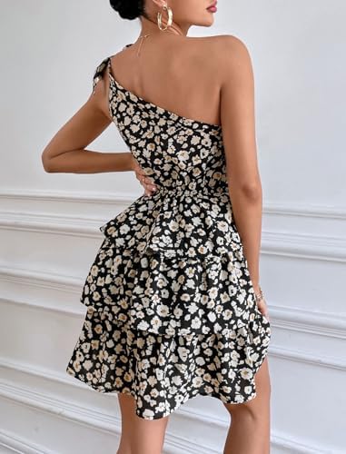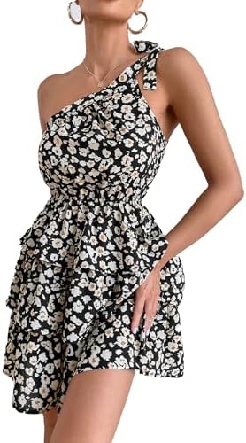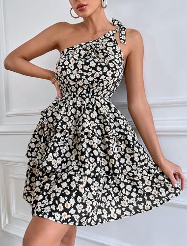 PRETTYGARDEN Women's Summer Tie One Shoulder Boho Floral Dress Elastic Waist Tiered Ruffle A Line Flowy Mini Dresses
