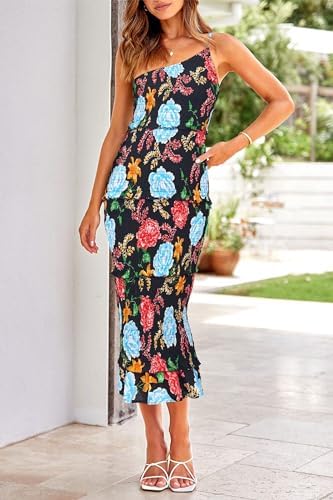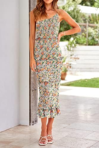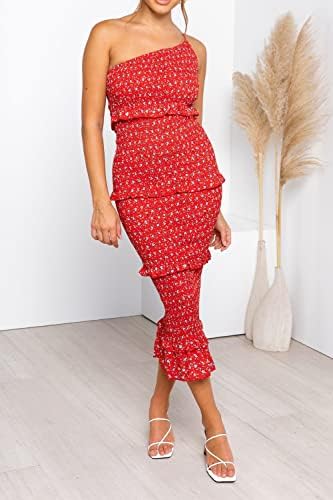 PRETTYGARDEN Womens Floral Summer One Shoulder Strappy Tiered Ruffle Midi Bodycon Dresses