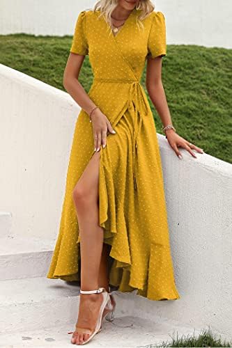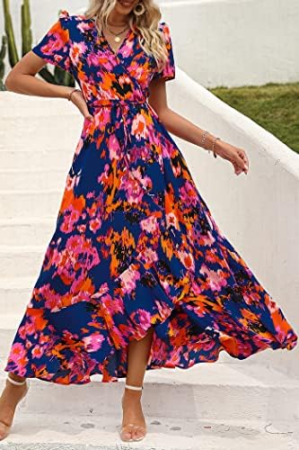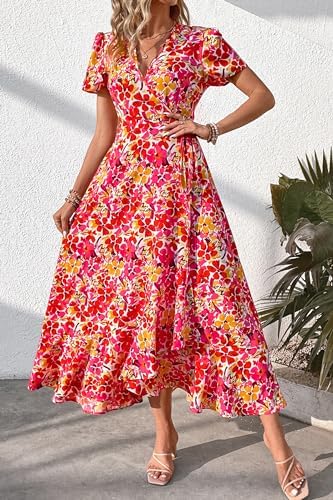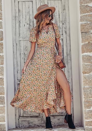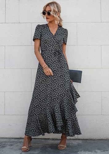 PRETTYGARDEN Womens Summer Wrap Maxi Dress Casual Boho Floral V Neck Short Sleeve Ruffle Hem Split Beach Long Dresses