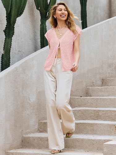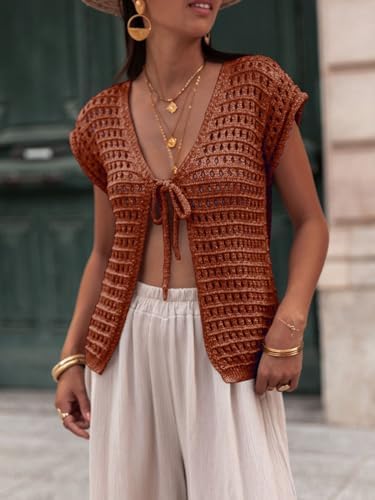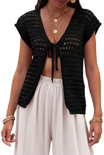 Saodimallsu Womens Tie Crochet Shrug Short Sleeve Open Front Lightweight Knit Cropped Cardigan Sweaters Cover Up