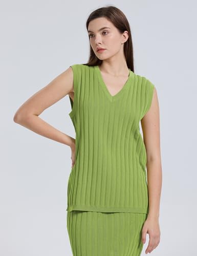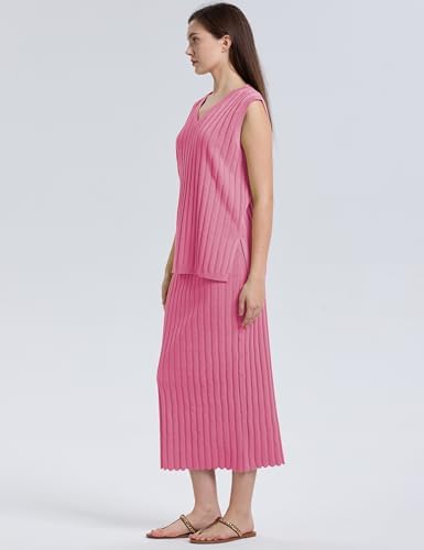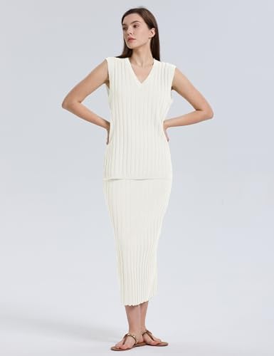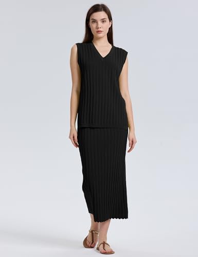 SCUSTY Women's 2 Piece Sweater Skirt Sets Sleeveless V Neck Knit Ribbed Vest Tops Midi Skirt