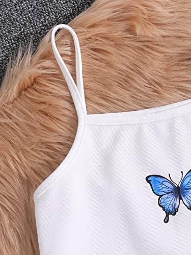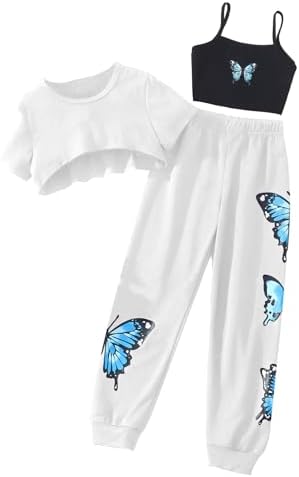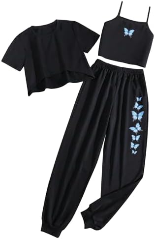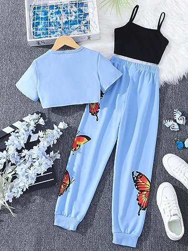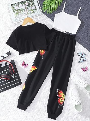 SOLY HUX Girl's Butterfly Print Cami Tops & High Low Hem Short Sleeve T Shirt with Sweatpants 3 Piece