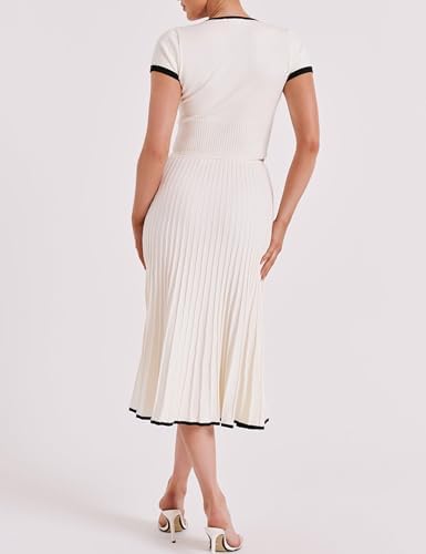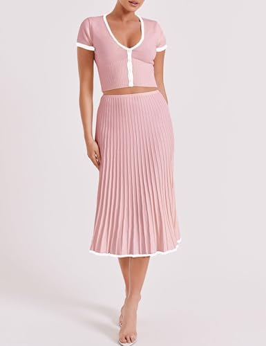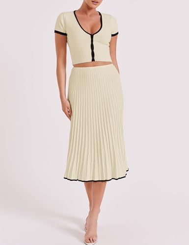 Tanming Women's Two Piece Skirt Set Casual Short Sleeve Crop Top Ribbed Knit Midi Pleated Skirt