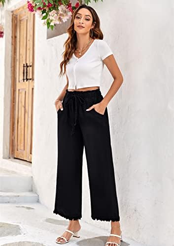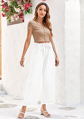 Valphsio Women's Baggy Wide Leg Jeans Tie Waist Chambray Culottes Tassel Pants Crop Length