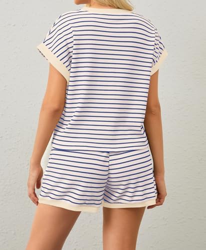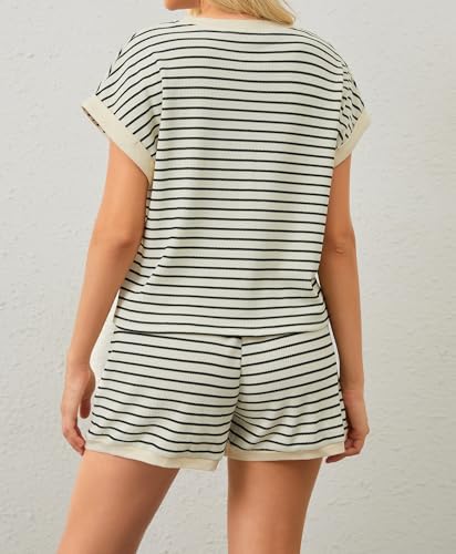 Women Summer 2 Piece Lounge Sets Striped Short Sleeve Tee Shirts Mini Shorts Loungewear Shorts Set Ribbed Pajama Set