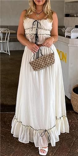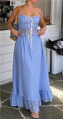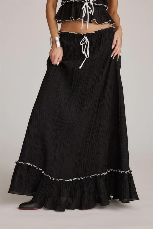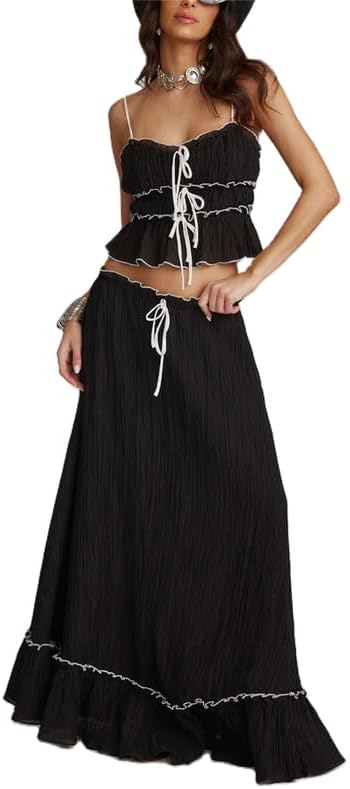 Women Y2k 2 Piece Outfits Patchwork Front Tie-Up Camisoles and Ruched Ruffle Maxi Skirt Matching Set Beachwear