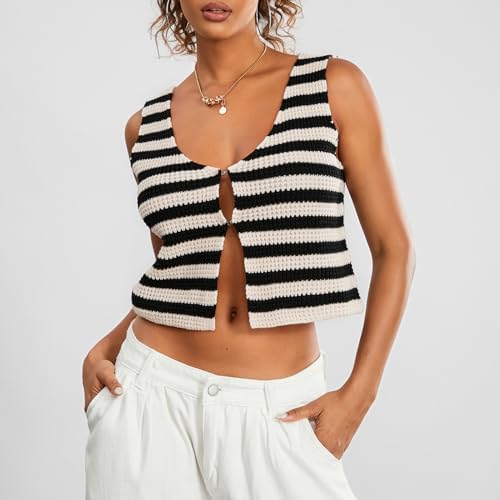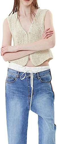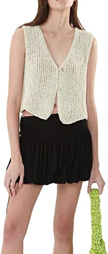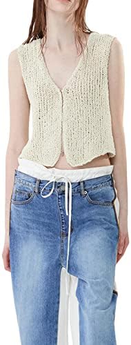 Women Y2k Button Down Crochet Knit Vest Sleeveless Hollow Out Crop Tops Vintage Casual V-Neck Versatile Streetwear