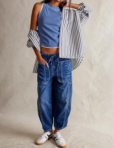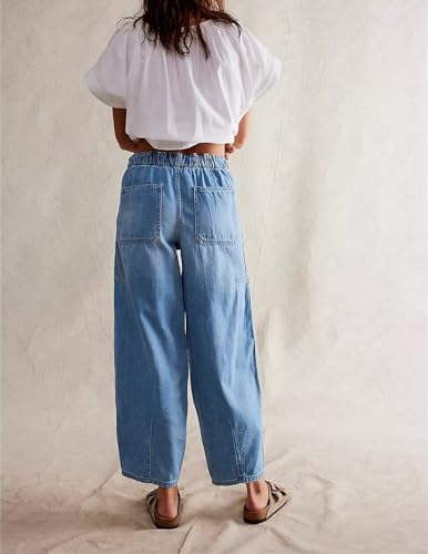 Women's Wide Leg Baggy Jeans Elastic Low Rise Barrel Jean Loose Boyfriend Denim Pants with Drawstring