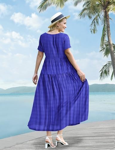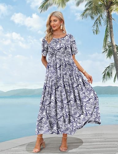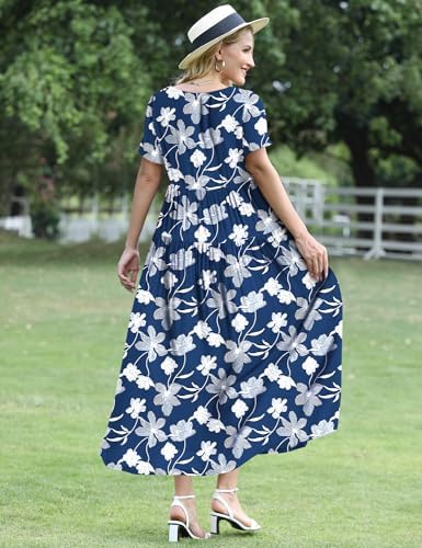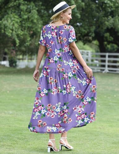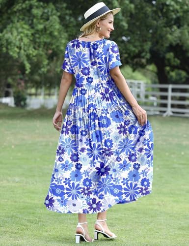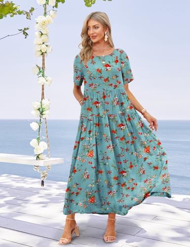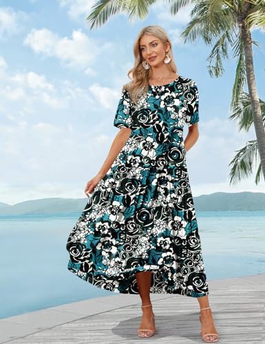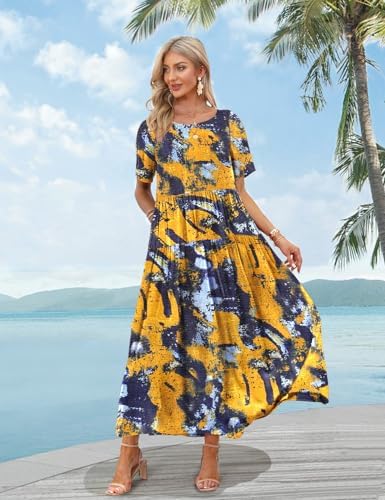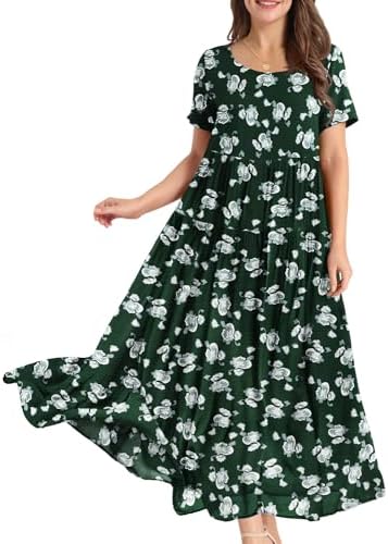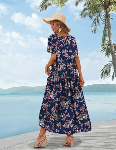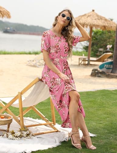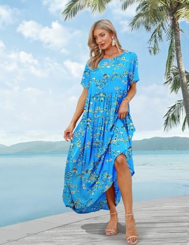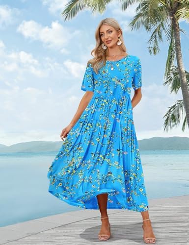 YESNO Women Casual Loose Bohemian Floral Dress with Pockets Short Sleeve Long Maxi Summer Beach Swing Dress EJF