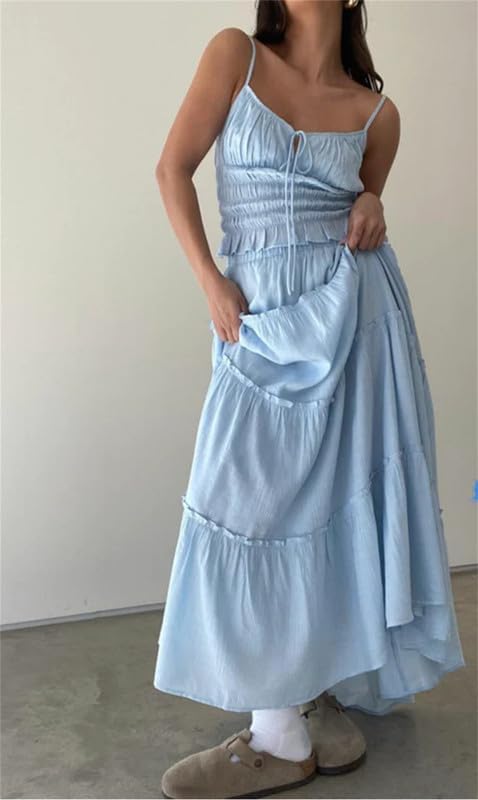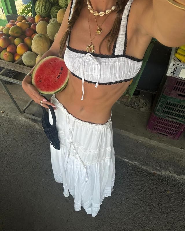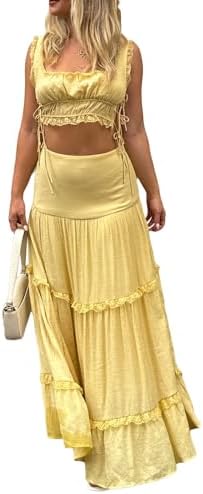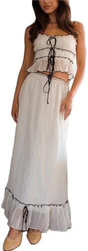 Yuemengxuan Women Y2k Ruffle Maxi Skirts Sets 2 Pieces Going out Set Sleeveless Lace Trim Cami Top Flowy Ruffle Long Skirts