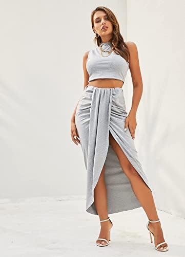 ZAFUL Women's Casual Sleeveless Summer Two Piece Outfits Crop Top and Side Split Draped Ruched Maxi Skirt Set Solid Suiting