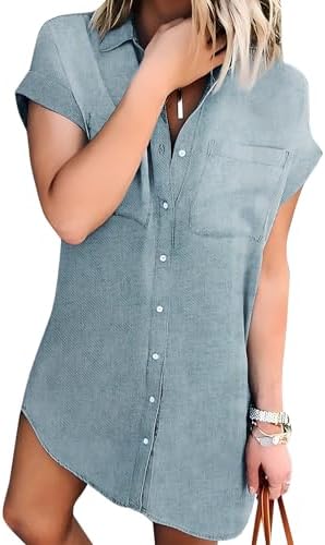 Zilcremo Women Denim Shirt Dresses Short Sleeve Distressed Jean Dress Button Down Casual Tunic Top